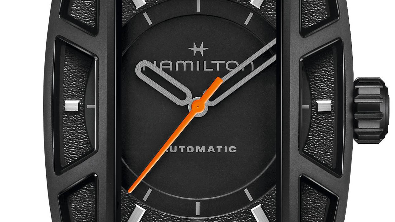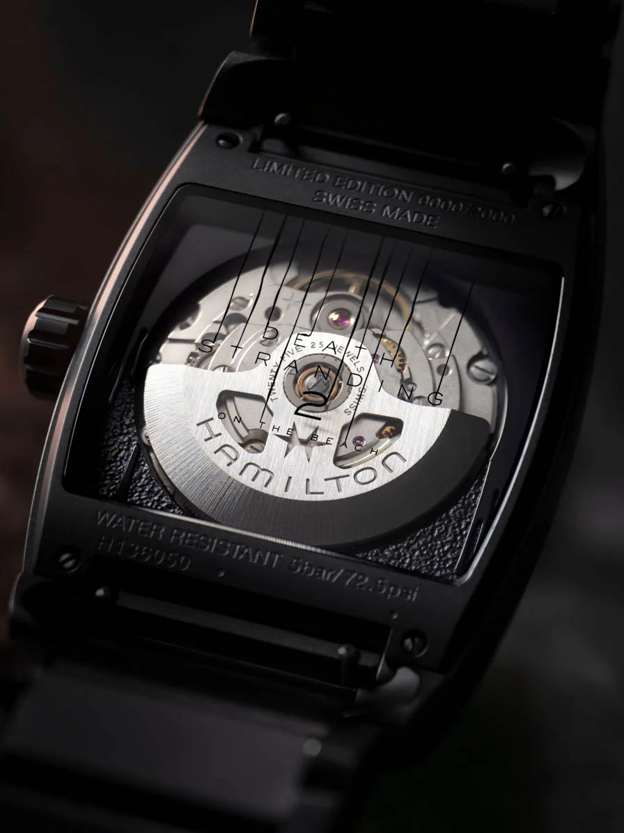 Both the case and integrated bracelet are lightweight titanium with a scratch-resistant black PVD coating. Paired with the unique 7-piece sapphire crystal and automatic movement, it ranks among the most technically equipped Hamilton American Classic Boulton models.