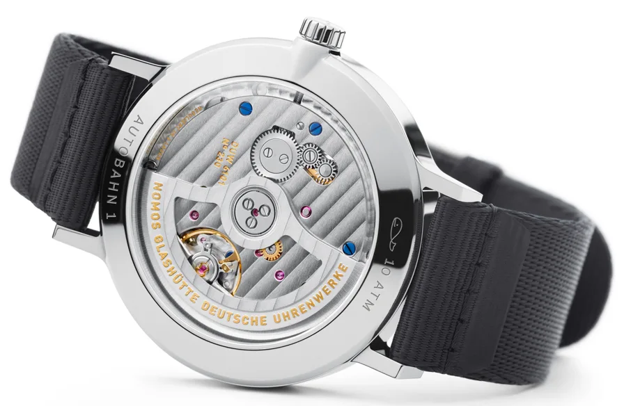 The Nomos Autobahn upholds the high standards of craftsmanship expected from any Glashütte watchmaker. It blends modern construction and materials with traditional finishing. Some elements are signature Glashütte finishes like the rhodium-plated surfaces, perlage finish and Glashütte ribbing, blue tempered screws, as well as golden engravings on the rotor.