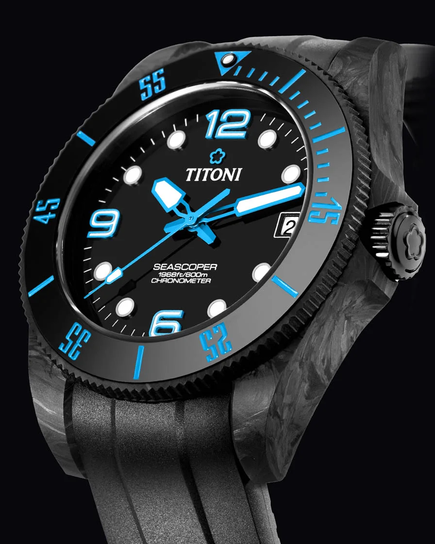 The Titoni Seascoper 600 CarbonTech pays respect to classic dive watch design while introducing modern improvements. It channels the spirit of the original 1963 Felca Seascoper, retaining the essentials: a rotating bezel, luminous markers, and a date window. In the Seascoper 600 CarbonTech configuration the Seascoper evolves by using cutting-edge materials and sharper styling to stand apart from traditional divers.