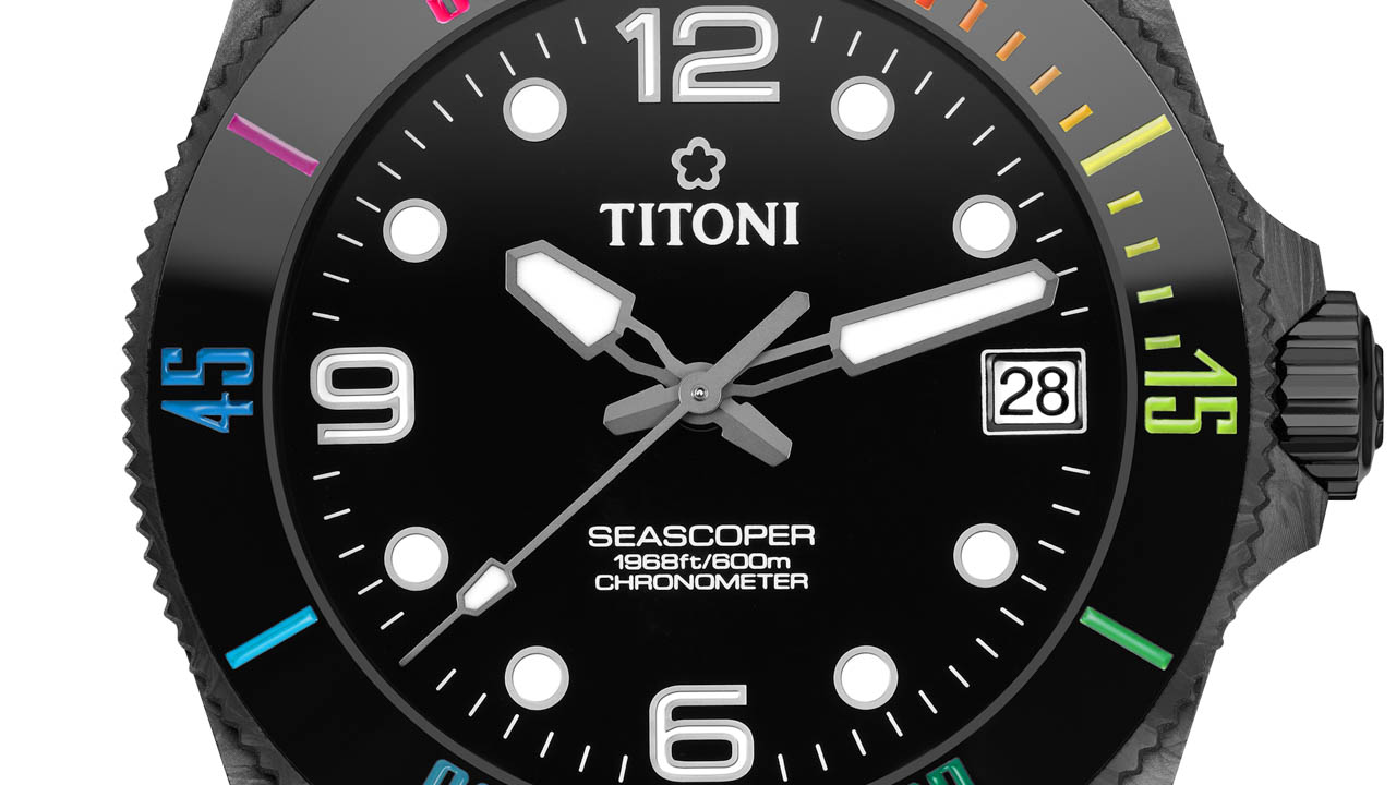 While all models share the same dial and case materials, there’s room for expression. Accent colours (blue, rainbow, white/silver), and strap choices (#tide ocean-plastic or rubber) allow some personalisation. The Titoni Seascoper CarbonTech carves out a unique identity in a saturated field of high end dive watches.